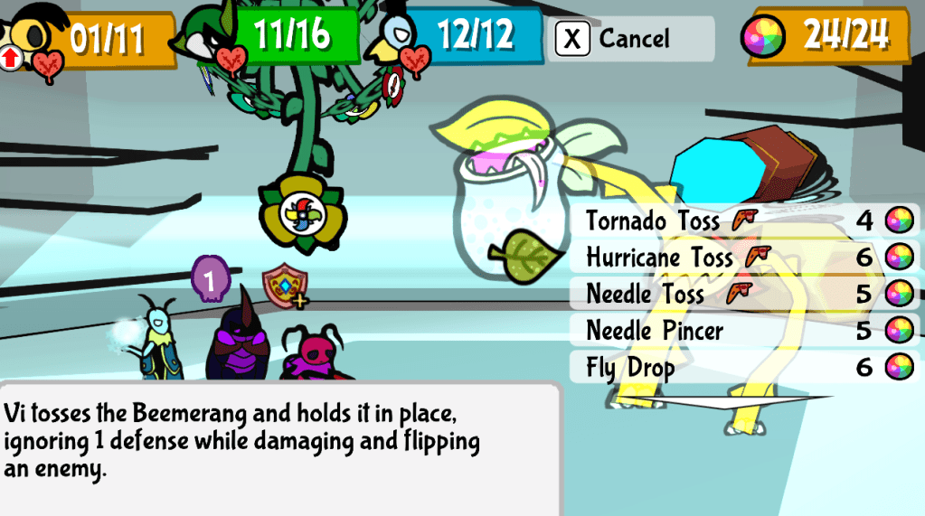 Let’s go over the combat basics. Like Paper Mario and TTYD, you’ve got HP, TP for special attacks (FP), and MP for medals (BP). You fight with Kabbu (a beetle), Vi (a bee), and Leif (a moth). Each one has their own unique basic attacks (Kabbu pierces DEF, Vi can hit flying enemies, and Leif can hit underground enemies) and special skills that use TP and you can equip medals that affect either the entire party of just one character. You can swap the positions of characters at any time (even when a character is knocked out!) as long as all active members haven’t used their turn. However, you only have three set formations: [Vi/Leif/Kabbu], [Kabbu/Vi/Leif], and [Leif/Kabbu/Vi]. Why is this important? Because the character in front gets a natural +1 to their attack power and is targeted more often.